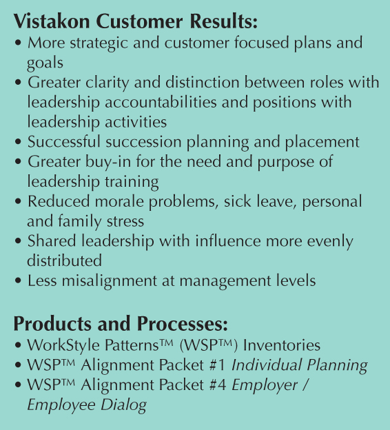 All team leaders, supervisors, and managers participated in a training program during which the appropriate WorkStyle Profile was determined for two years out and five years out. Each person identified his or her preferred WorkStyle and created his or her own transition and skill development plan to meet both current and future leadership requirements.