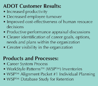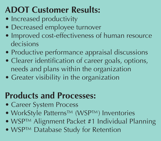 ADOT, like many organizations, was reeling from the complexity and rapidity of change. Its managers and employees were facing the challenge of facilitating career transitions in a constantly changing workplace. ADOT had previously taken an individual and programmatic approach to career planning. The Human Resource Development Center had offered workshops and programs to help employees identify their interests, values, WorkStyle, skills and work experience. These activities had been provided in isolation and were not connected to other organizational processes.