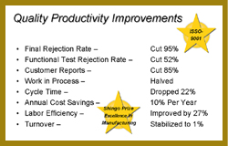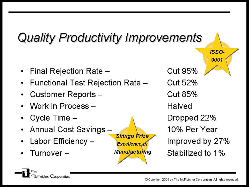 A telecommunications subassembly facility has consistently exceeded all financial and production goals since 1986, and earned many coveted quality and world-class manufacturing awards. McFletcher’s Teaming by Design and work design processes were key to slashing process rejection rates by more than 66 percent, reducing work in progress by 50 percent and realizing savings on indirect labor with 1 percent employee turnover.