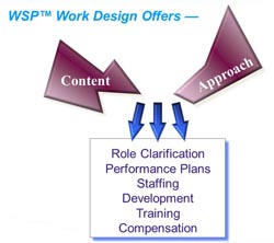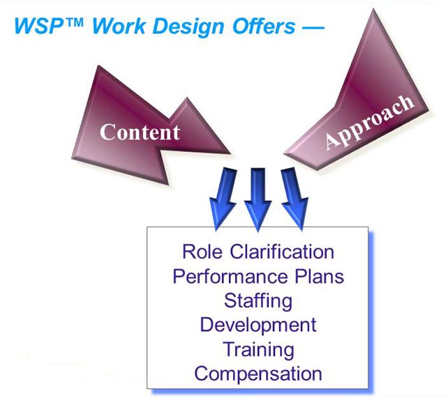 WSP™ Work Design TechnologyWork Design Process for Organizational ShiftsStructural shifts accelerate as organizations experience major changes such as mergers, divestitures and product start-ups. New work requirements emerge, old requirements disappear, and functions are redistributed. The WorkStyle Patterns® Work Design Process provides the technology to assess and direct work changes. This process facilitates major breakthroughs in how to prepare for and implement position, team, function and organizational design. WorkStyle Work Design FlowSeven Phases There are seven distinct phases of WorkStyle Work Design outlined in an eight-chapter process guide. Movement through any one phase may be short and speedy or extensive and deliberate, depending upon the extent of work and organizational variables. The following seven phases of WorkStyle Work Design are custom-tailored to the needs of the organization: